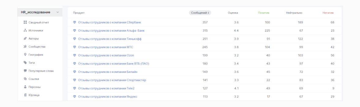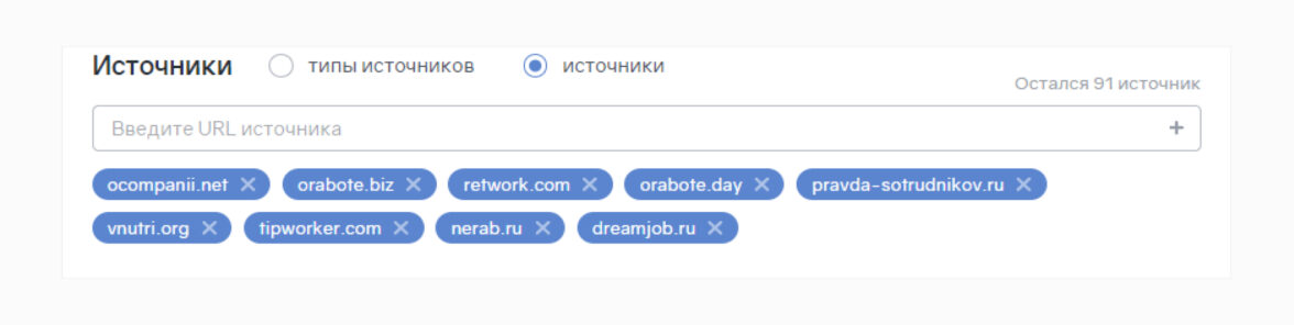 Начали с подбора источников. Собрали список самых, на наш взгляд, адекватных HR сайтов отзывов и выбрали самые посещаемые. Их и указали в настройках темы мониторинга.