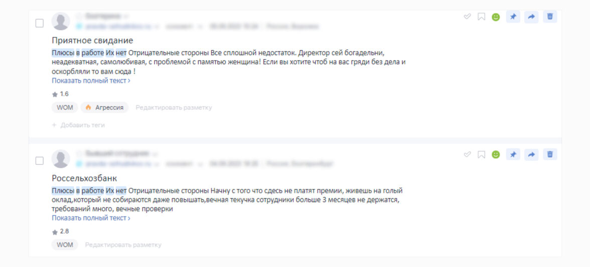 К сожалению, не на всех сайтах отзывы с указанием рейтингов. С такими отзывами работали по другой схеме. Сначала отработали все отзывы категорий «Агрессия» и «Нецензурная лексика». Но и такого способа быстрой фильтрации сообщений оказалось недостаточно. Стали подбирать слова-индикаторы и, используя поиск, отбирать те отзывы, в которых они присутствуют. Какие-то маркеры отрабатывали очень хорошо, какие-то слабее.