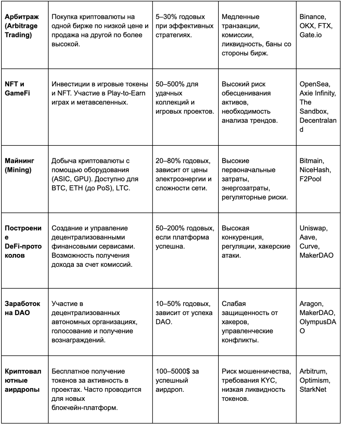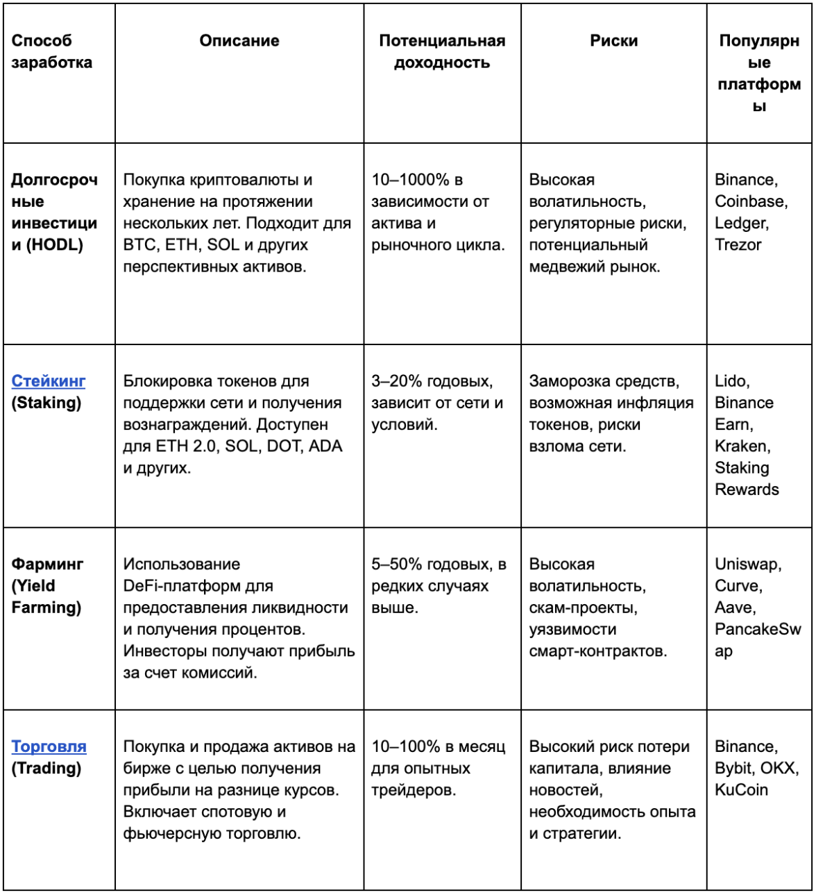 Этот список охватывает основные стратегии заработка на криптовалюте в 2025 году. Важно понимать, что высокая доходность сопровождается рисками, а эффективные инвестиции требуют анализа и диверсификации.