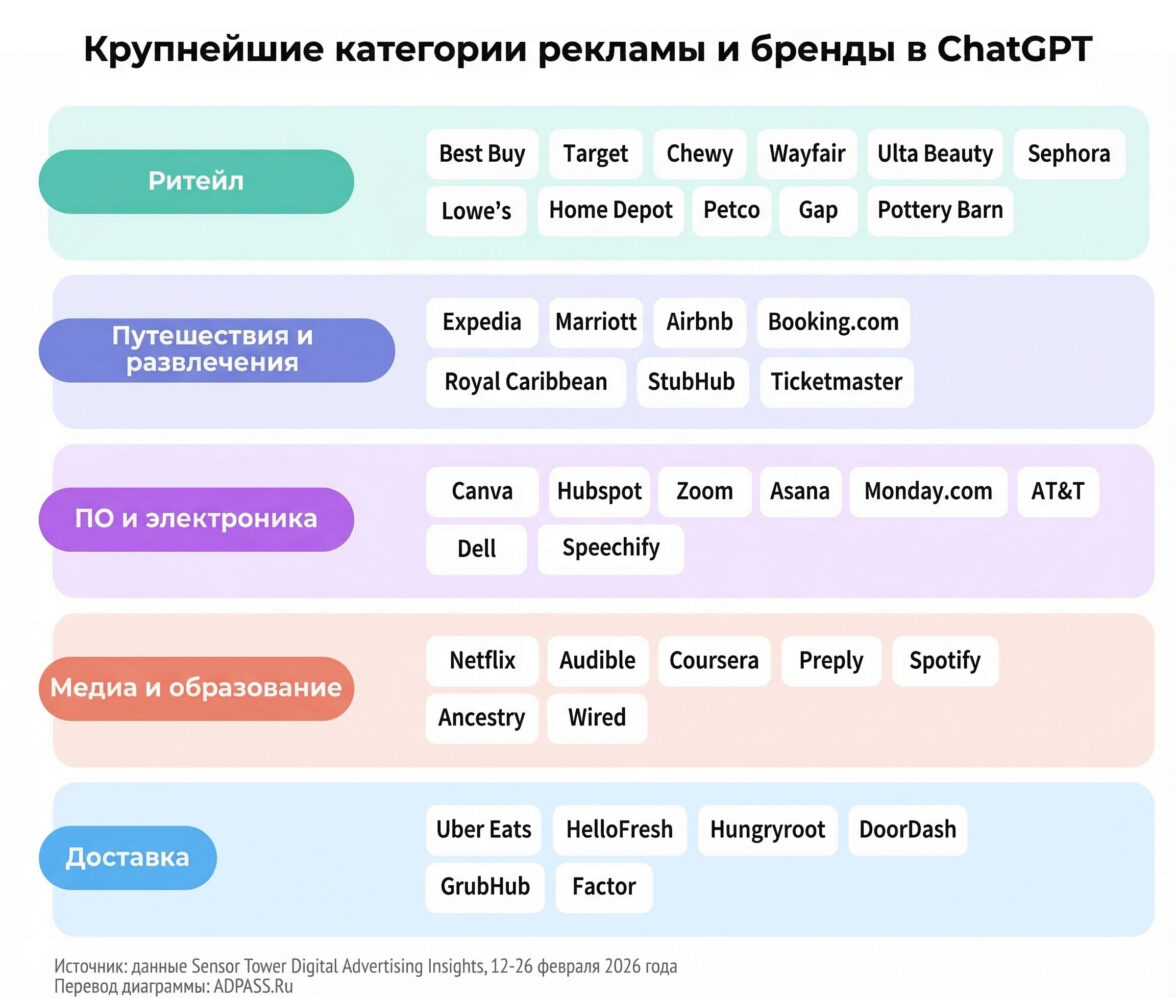 Аналитическая компания Sensor Tower собрала первые данные о рекламе в ChatGPT. За две недели наблюдений с 12 по 26 февраля система зафиксировала более 100 отдельных брендов в рекламных блоках.