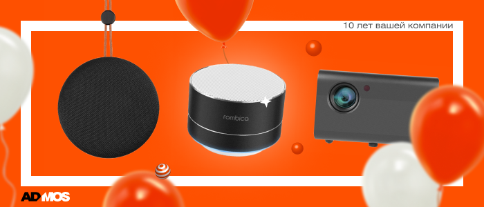На 10-летие любимой компании каждый ADMOSёнок получил по брендированной беспроводной колонке Rombica. В 2016 году этот бренд был топовым по дизайну и качеству звука — и мы не смогли пройти мимо этого факта. Получилось стильно, музыкально, громко — и очень оранжево!