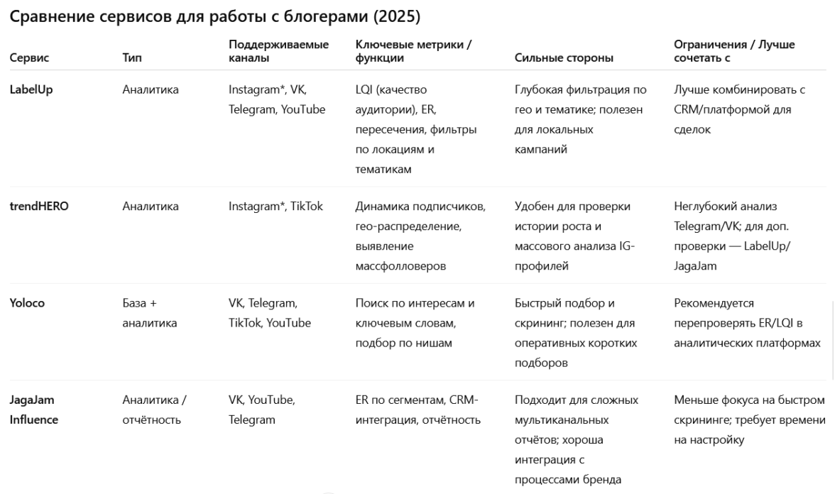 Это значит — выбранный инструмент должен решать конкретную операционную задачу: проверка блогера, составление списка для локальной кампании, проверка пересечений аудиторий, автоматизация сделок или экспорт отчётов в CRM.