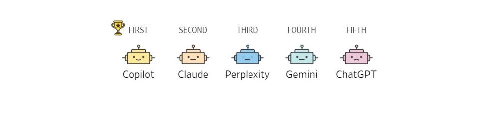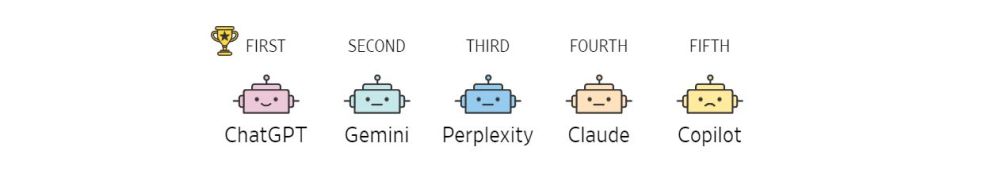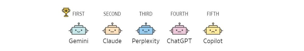 Самый большой сюрприз ждал авторов рейтинга (по их признанию), когда они подсчитывали общие результаты «Олимпиады чат-ботов». Самый именитый ChatGPT занял лишь второе место, а чемпионом признан американский стартап-единорог Perplexity (оценен в 2024 году более, чем в $1 млрд). Третье место — у Gemini.