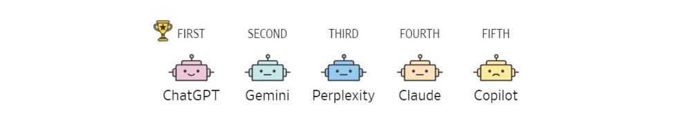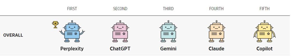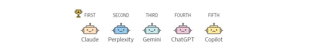 Американское деловое издание Wall Street Journal составило рейтинг чат-ботов по их полезности в повседневной жизни людей. Журналисты не стали озадачиваться техническими характеристиками пяти крупнейших языковых систем, а задавали им вопросы, которые волнуют людей в повседневной жизни: о здоровье, финансах, еде, новостях и пр.