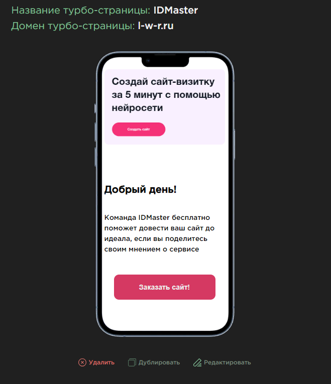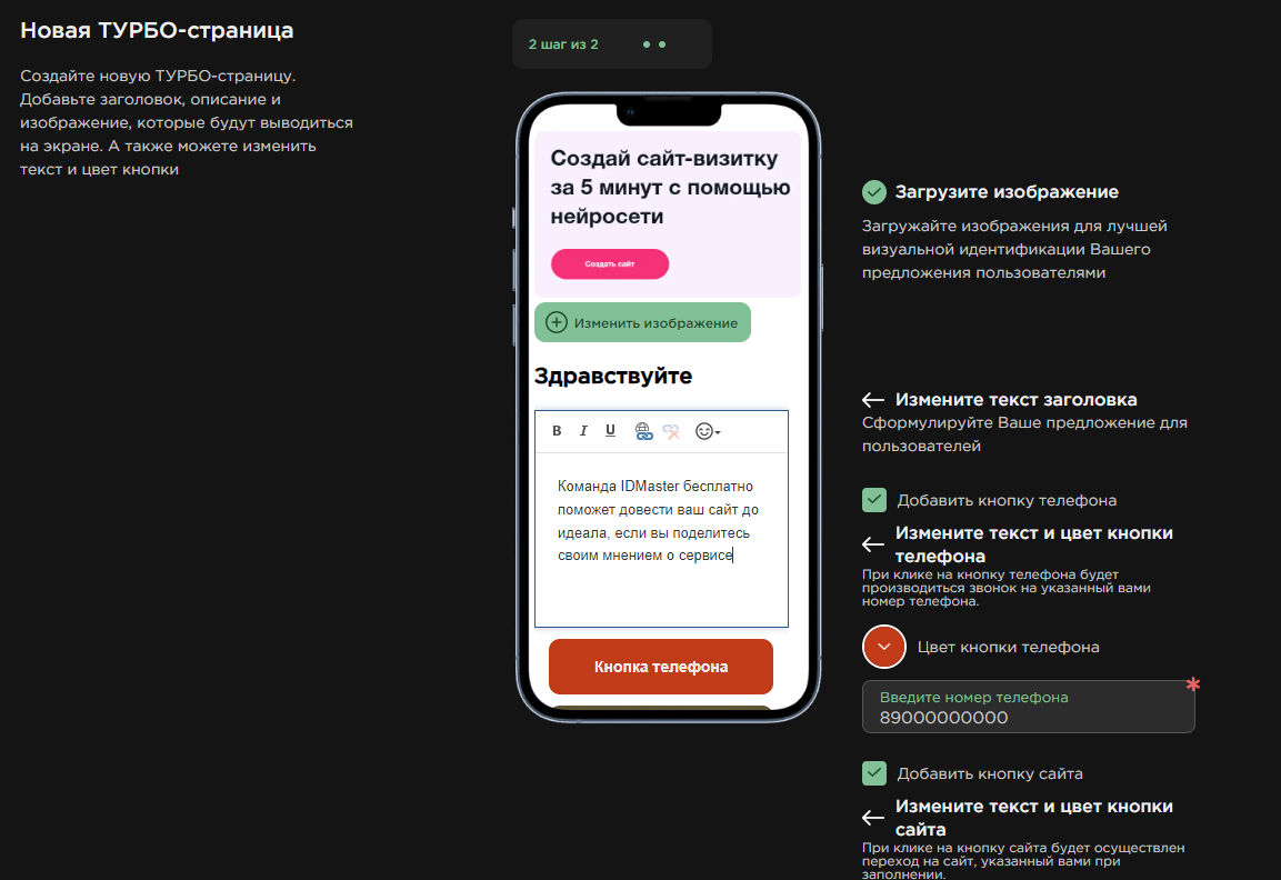 Создание мини-лендингов для SMS-рассылок с возможностью добавления кликабельных номеров телефонов, кнопок на сайт или социальные сети.