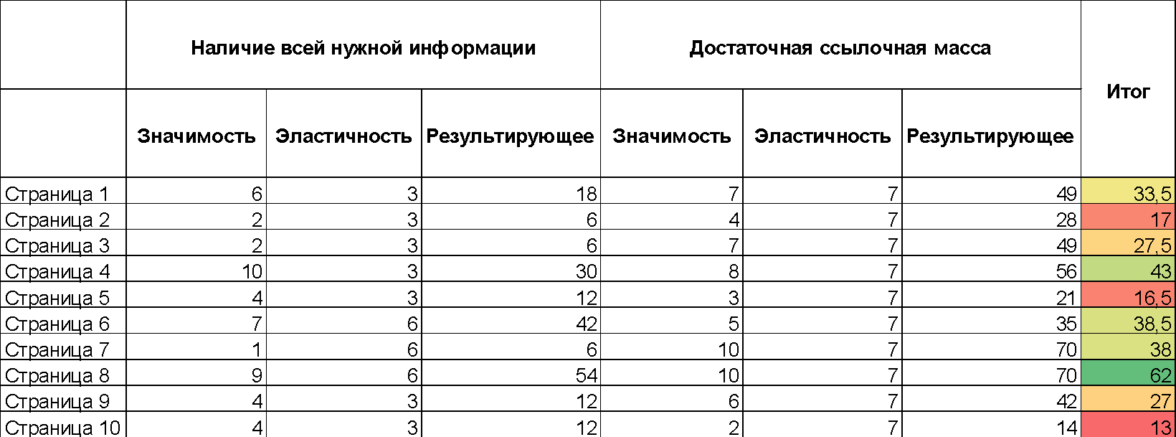 Каждой странице поставьте оценку по этим параметрам. Оценивается значимость (важность увеличения параметра для роста страницы в поисковой выдаче) и эластичность (насколько легко добиться этого увеличения).
