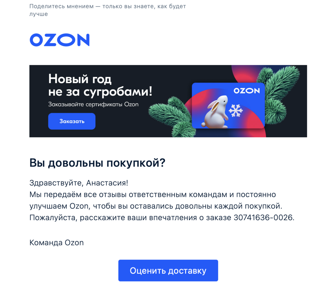 Запросы отзывов. Письма, которые автоматически приходят после покупки и предлагают оценить товар на сайте или доставку.