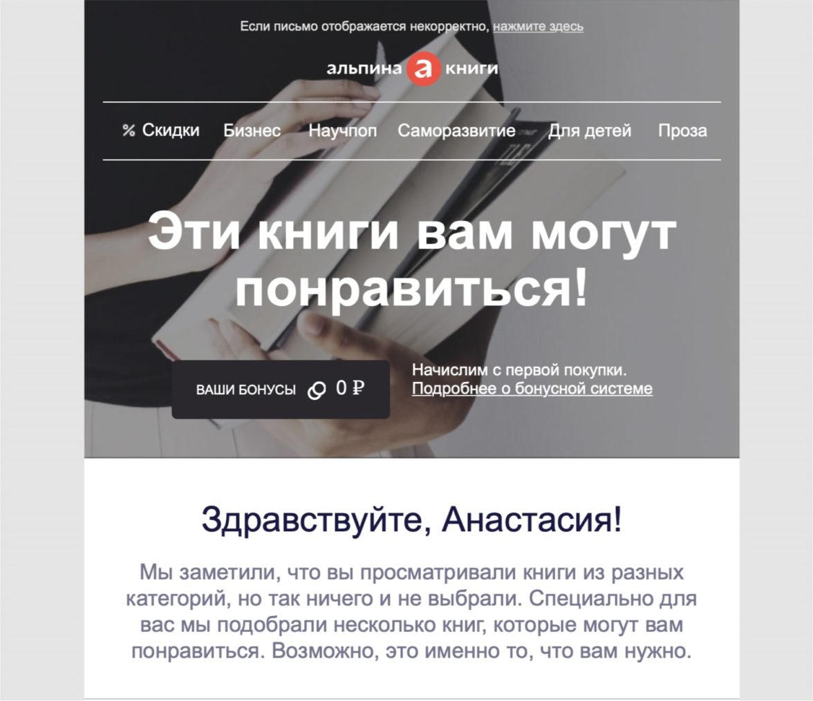 Персонализированные подборки. Предлагают клиенту товары, которые похожи на те, которые он покупал или просматривал. Такие письма часто присылают книжные интернет-магазины.