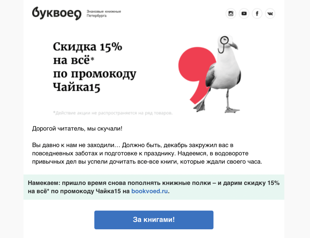 Письма о распродажах. Эти письма тоже про скидки, но обычно сообщения информируют клиентов о снижении цен на группу товаров. Например, маркетинговая рассылка от книжного магазина рассказывает о снижении цены на 1300 книг, а минимальная стоимость начинается от 200 рублей. Это мотивирует клиента зайти на сайт и посмотреть варианты по скидке.