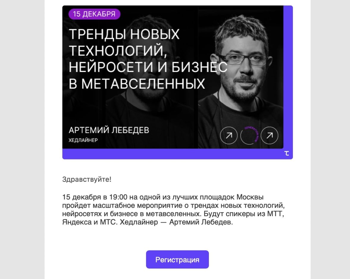 5. Письма-анонсы. Анонсируют мероприятия бренда: собственные или те, где участвует компания. В рассылках приглашают пользователей на конференции, вебинары, маркеты и другие события. Если мероприятие платное, то письмо также можно считать продающим, как в примере.