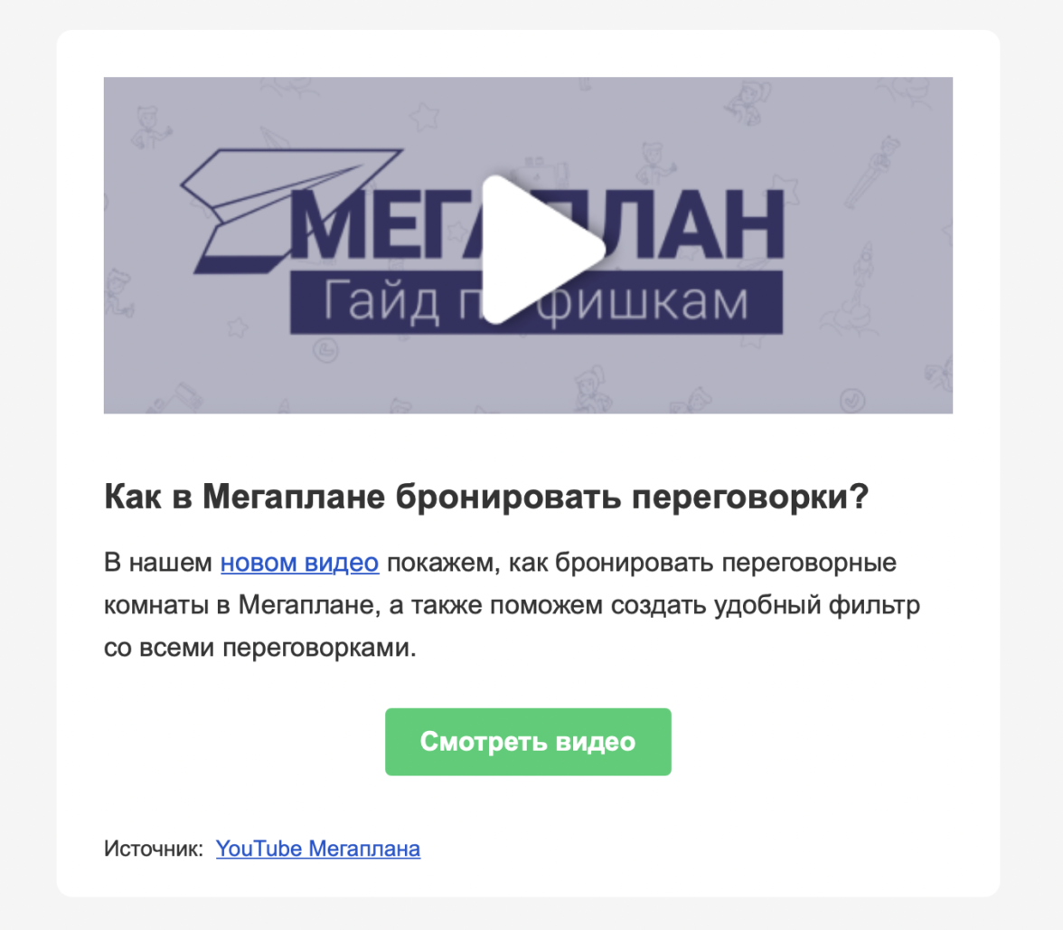 Обучающие рассылки. Рассказывают, как пользоваться продуктом или смежными сервисами/товарами. Например, онлайн-система для планирования присылает письмо с обучающим видео по бронированию переговорных через сервис.