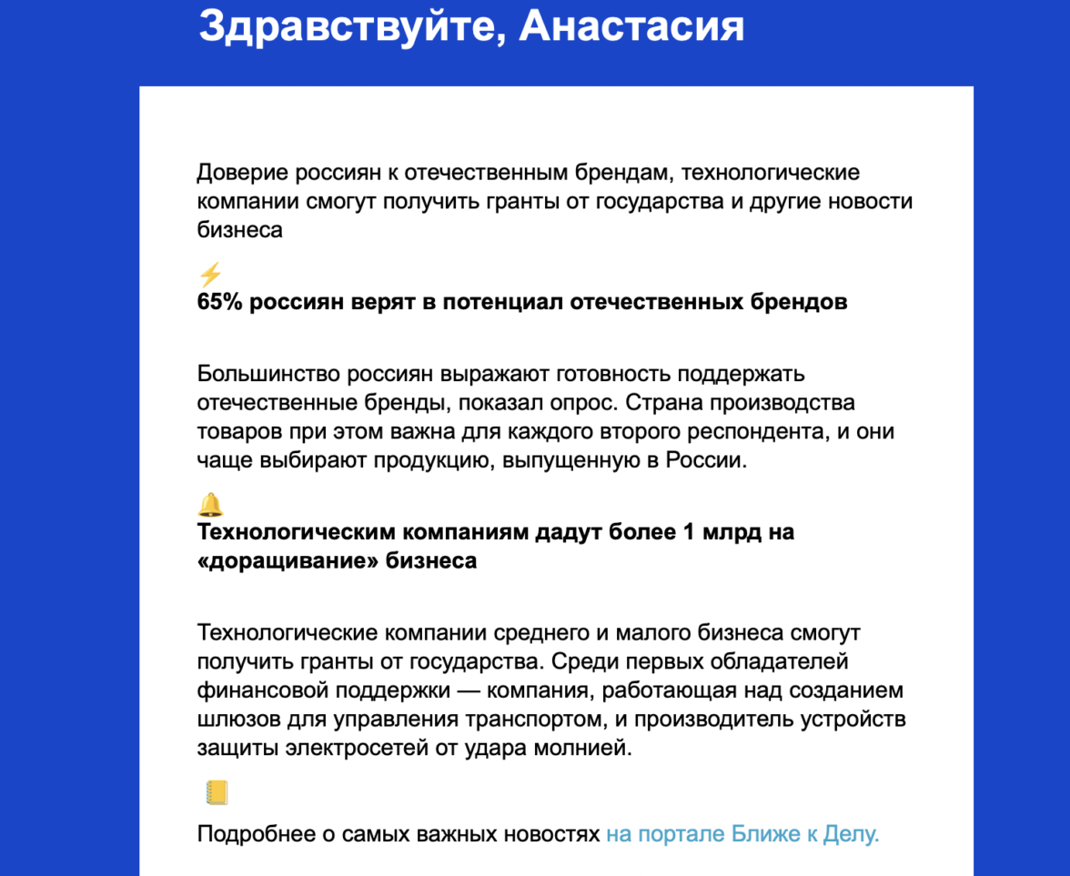 Эмейл с контентом не продаёт напрямую, но подготавливает пользователя к покупке. Если письма персонализированные, то Open Rate повышается до 50%. Примеры email рассылок с контентом — полезные, обучающие, дайджесты.