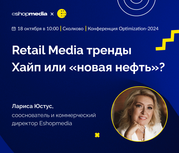 18 октября в 10:00 сооснователь и CCO Eshopmedia Лариса Юстус поможет разобраться в вопросах в рамках секции «Продвижение в e-commerce» на конференции Optimization-2024 в Сколково.