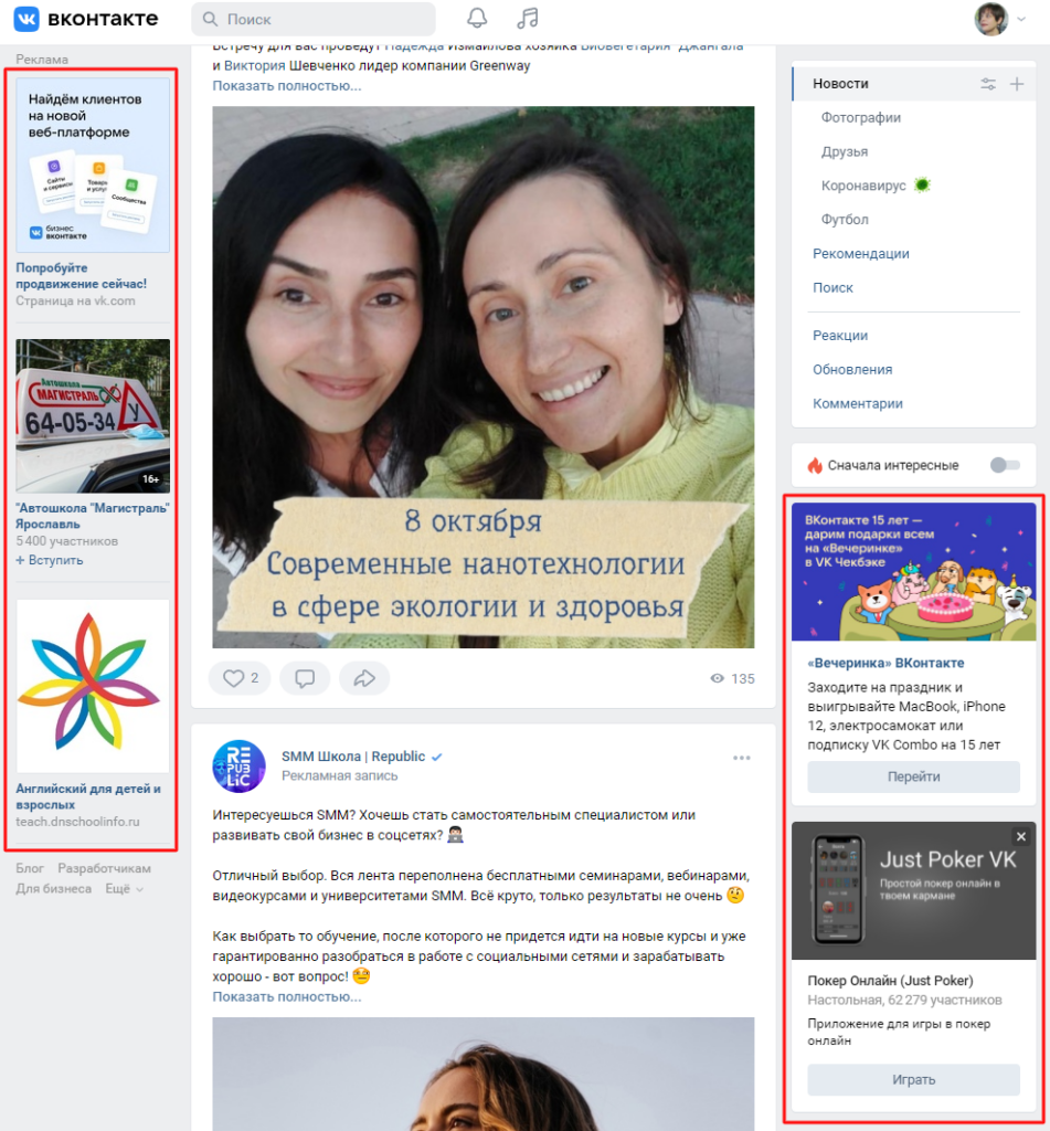 Объявления таргетированной рекламы размещаются в новостной ленте, в левой и правой части страницы ВК.