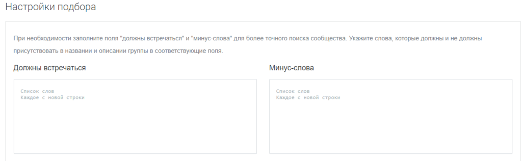 Быстро подобрать нужные группы поможет бесплатный парсер сообществ ВКонтакте. При помощи инструмента можно отобрать сообщества с целевой аудиторией, указав нужное количество подписчиков и пересечений с аудиторией вашей группы. Для более точного поиска укажите ключевые фразы и минус-слова: