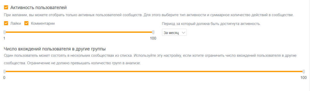 3. «Активность в сообществах». Среди участников сообществ выбираются те, которые лайкают и комментируют посты. Для сбора активных участников используйте бесплатный парсер пользователей ВКонтакте. Он соберет ID пользователей из целевых сообществ. Можно выбрать тип активности, их количество и период, за который они происходили: