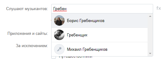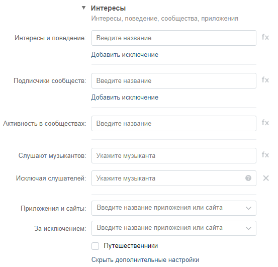 5. «Слушают музыкантов». Опция полезна для настройки рекламы концертов. Можно также исключить поклонников того или иного исполнителя. Рекомендуем пользоваться этой настройкой с осторожностью, т. к. она сильно сужает аудиторию.