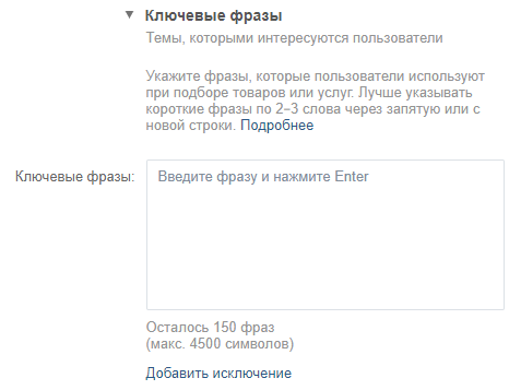 Введите ключевые слова через запятую. Максимальное количество — 150 фраз и 4500 знаков. По клику на ссылку «Добавить исключение» откроется окно для минус-слов.
