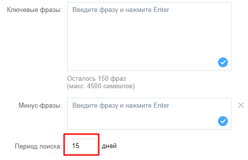 Алгоритм подсказывает похожие ключевые слова и дает прогноз охвата. Также нужно задать период поиска (по умолчанию установлено 12 дней, максимально можно задать 30). Это период интереса аудитории к товару или услуге. Для более дорогих услуг и сложных продуктов стоит выбирать период побольше.
