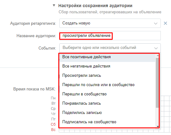 Вы можете сохранить данные пользователей, просмотревших рекламное сообщение, для дальнейшей работы. В выпадающем меню «События» можно выбрать одно или несколько желаемых реакций на объявление.