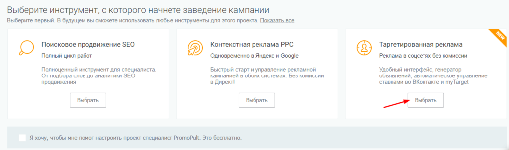 Для запуска кампании зарегистрируйтесь в PromoPult, нажмите «Добавить проект» и выберите модуль «Таргетированная реклама»: