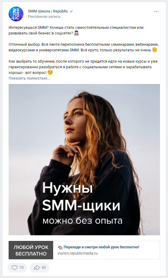 Пример таргетированного промопоста в новостной ленте ВК