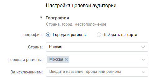 При настройке географического таргетинга нужно ориентироваться на местность, в которой находится целевая аудитория. Например, можно выбрать страну или город. Также для геотаргетинга ВКонтакте есть функция исключения — разрешается исключить конкретный город или регион из списка.