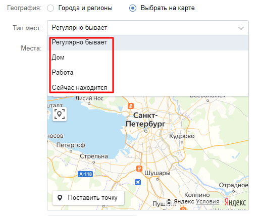 Можно выбрать, какое отношение человек имеет к месту: работает, живет, регулярно бывает или находится непосредственно в момент показа рекламного объявления.