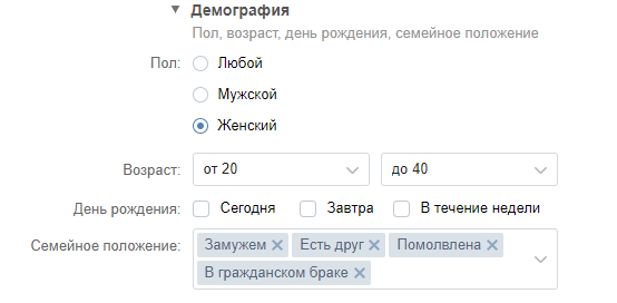 Следующий вид таргетинга — демографический. Он позволяет выбрать аудиторию для показа рекламы по полу, возрасту, семейному положению и дате рождения.