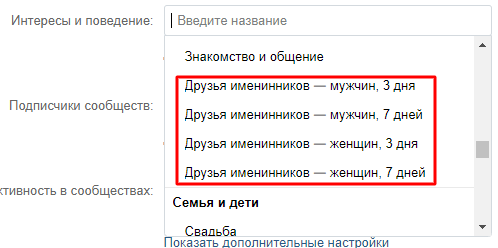 друзей именинников — показывать им рекламу за 3 и 7 дней до наступления дня рождения (есть разделение по полу);