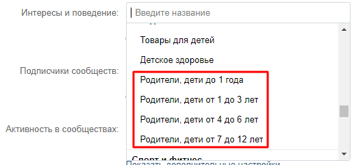 Полезный вид таргетинга — сегментирование по интересам. Доступны следующие характеристики: