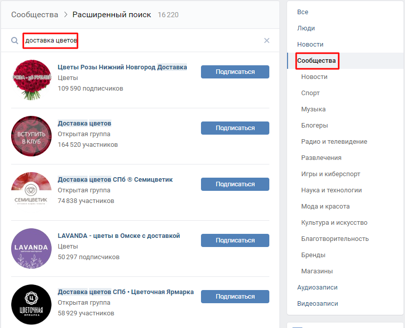 Для того чтобы найти подходящие сообщества, введите ключевые слова в строку поиска ВКонтакте: