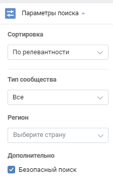 Точнее настроить поиск (выбрать регион, сообщество или мероприятие) помогут параметры: