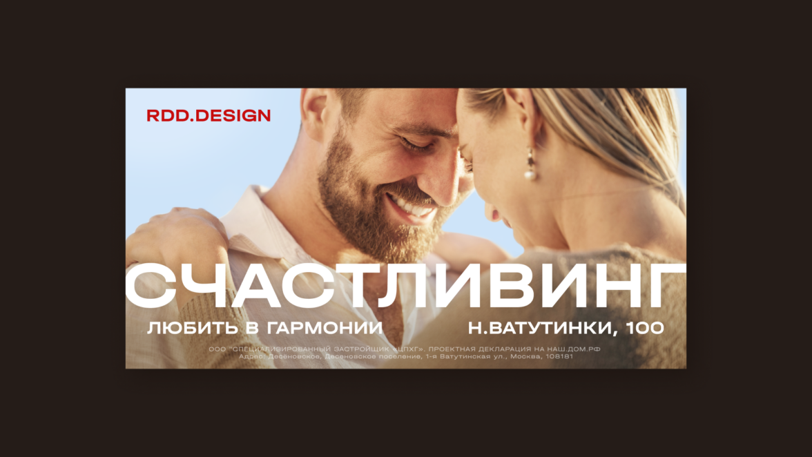 Креативная команда проекта разработала концепцию рекламной кампании, основанную на таком простом и одновременно комплексном понятии счастливой жизни. Сама концепция переросла в коммуникационную матрицу с фокусом на УТП проекта. То есть получается мы сместили фокус позиционирования проекта с квартала российских дизайнеров на жизнь человека, который будет жить в этом проекте. За счет богатейшей инфраструктуры RDD счастье потребителю обеспечено.