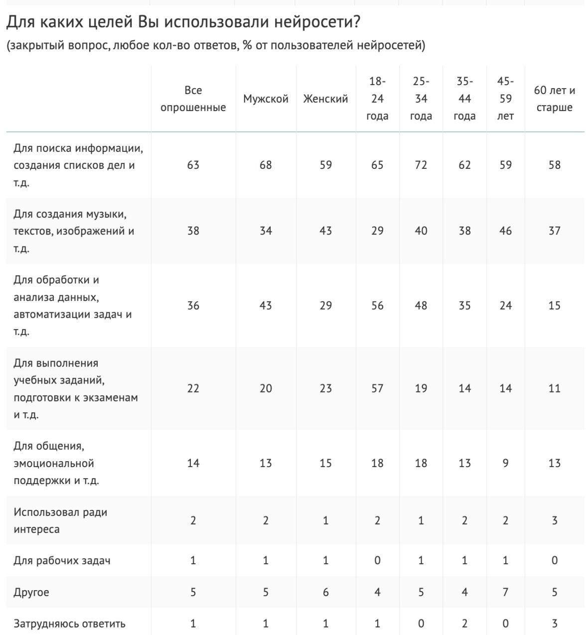 Преобладающий ответ на вопрос «С какой целью вы использовали нейросети» (респонденты могли дать несколько ответов) — для поиска информации. Так ответили 63% опрошенных (68% мужчин, 59% женщин). Каждый третий (38%) создавал музыку, тексты, изображения с помощью нейросети. Третья по популярности цель использования — для обработки и анализа данных, автоматизации задач — 36%. Каждый пятый (22%) использовал нейросети в учебных целях. Каждый седьмой (14%) обращался к чат-боту за эмоциональной поддержкой, с целью общения.