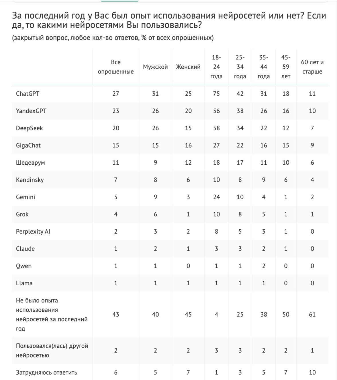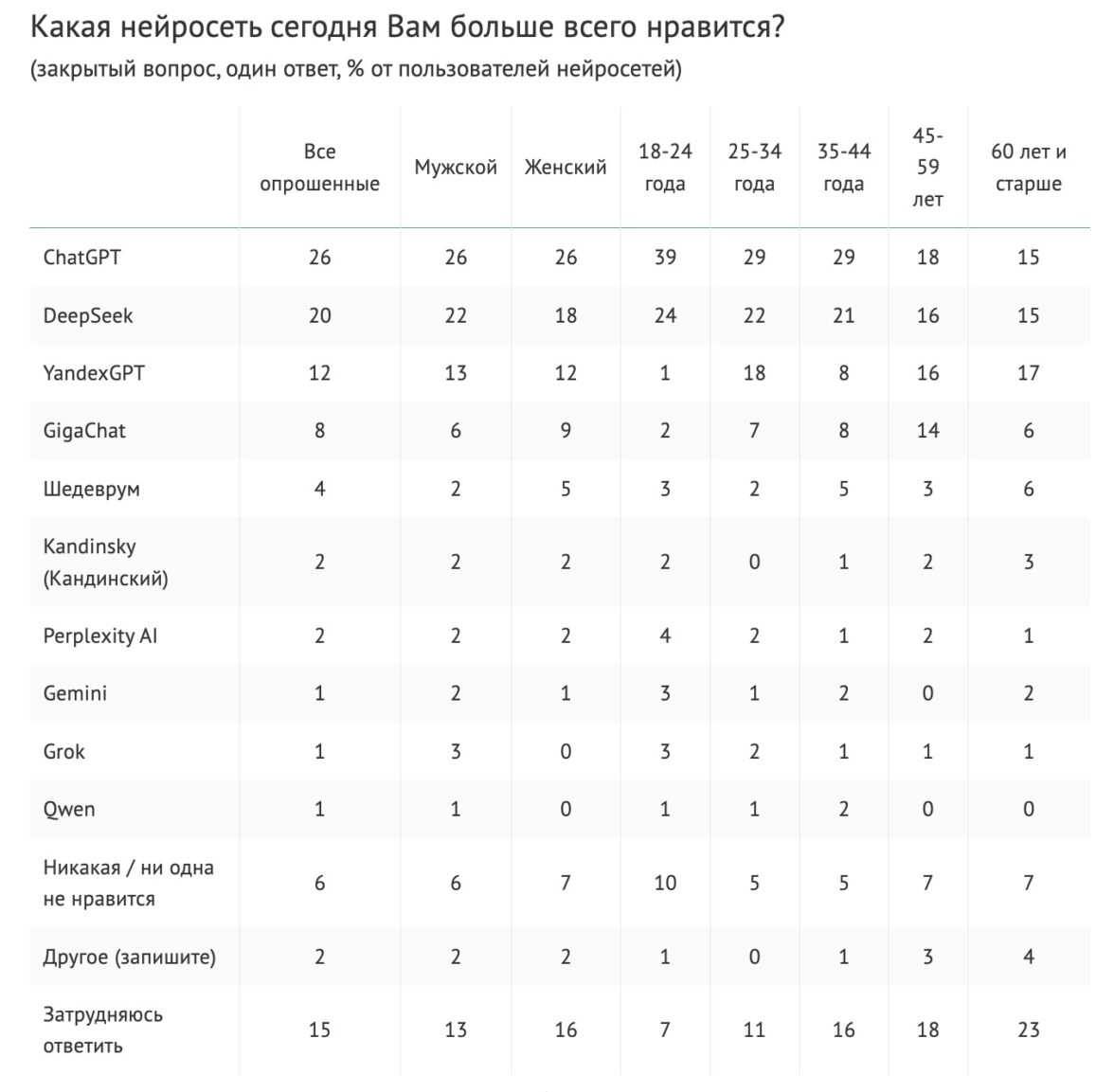 Отвечая на похожий вопрос «Какую нейросеть вы могли бы назвать бы самой умной?» чаще всего пользователи чат-ботов называли ChatGPT — 30%. Второе место занял DeepSeek (8%), третье — YandexGPT (5%).