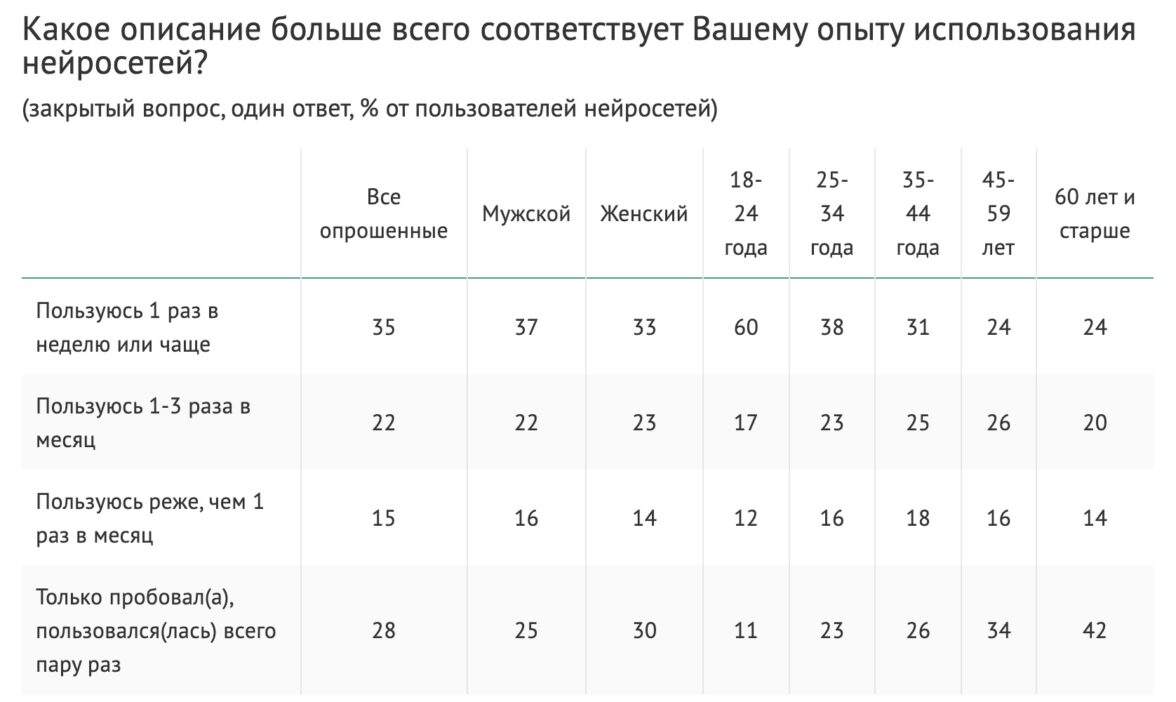В той половине россиян, что пользуются нейросетями, примерно каждый третий (35%) делает это активно — раз в неделю или чаще. Спеди 18–24 летних частых пользователей большинство — 60%. Среди тех, кому за 60, так часто имеет дело с чат-ботом только каждый четвертый (24%). Примерно каждый пятый (22%) — один-три раза в месяц. 15% делают это редко, меньше раза в месяц. А четверть (28%) опрошенных сообщили, что только попробовали, всего пару раз.