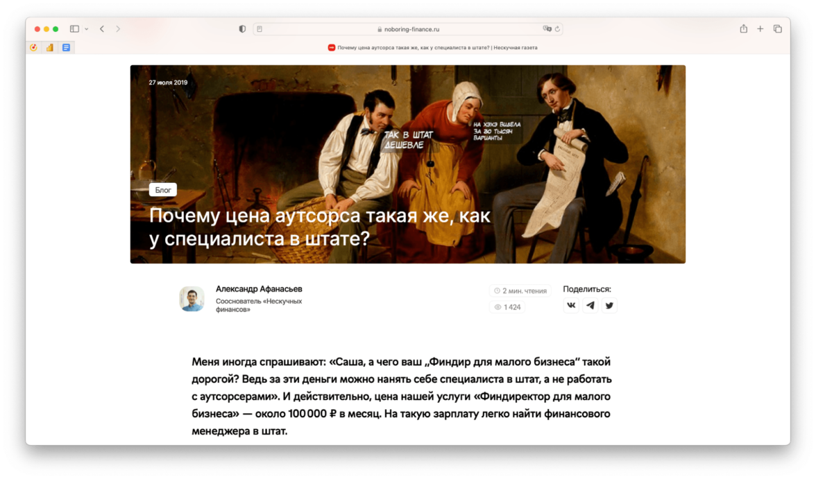Например, «Нескучные финансы» продвигают аутсорсинг финансового директора с помощью книжки про управленческий учет. Там они знакомят читателей с основными отчетами, дают попробовать шаблоны. Предприниматель пробует вести учет сам, понимает, что вещь нужная — и хочет ее делегировать. Он уже знает про «Нескучные финансы», поэтому с большой вероятностью делегирует им