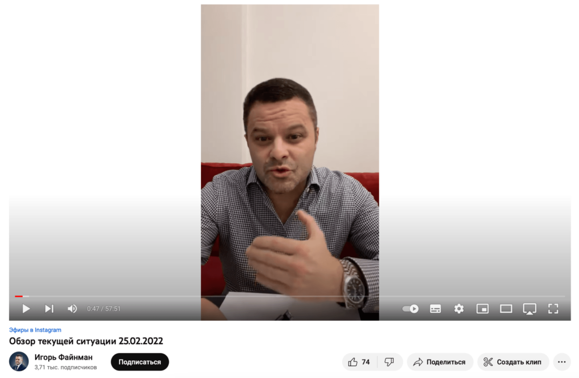 Инвестор Игорь Файнман уже 25 февраля вышел в эфир со своими комментариями о ситуации на фондовом рынке. Подобный инфоповод — это не только возможности приобрести новых зрителей, но и поддержка уже существующих читателей