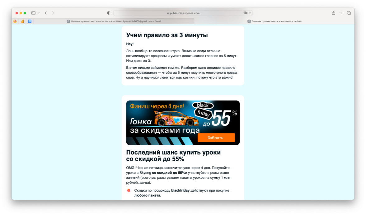 Каждая рассылка Skyeng — это что-то полезное про английский язык и обязательно оффер. Потому что почему бы и нет: ведь вдруг именно с этого письма подписчик решит что-нибудь купить