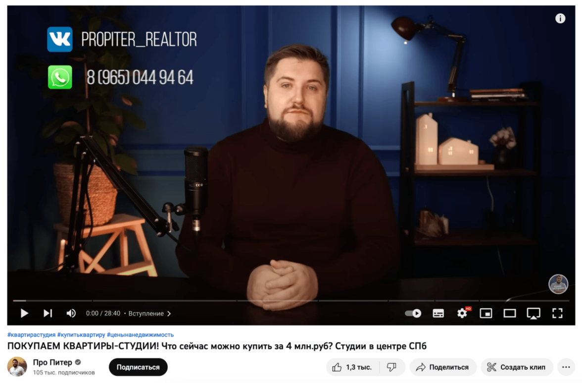 Риелтор Юрий Останин делает контент про покупку недвижимости в Санкт-Петербурге. Когда у человека появляется задача купить квартиру в СПб, он начинает в этом разбираться → выходит на видео Юрия, потому что они в топе по узким запросам → видит приятного знающего человека, а также много подписчиков и отзывов → начинает доверять агентству