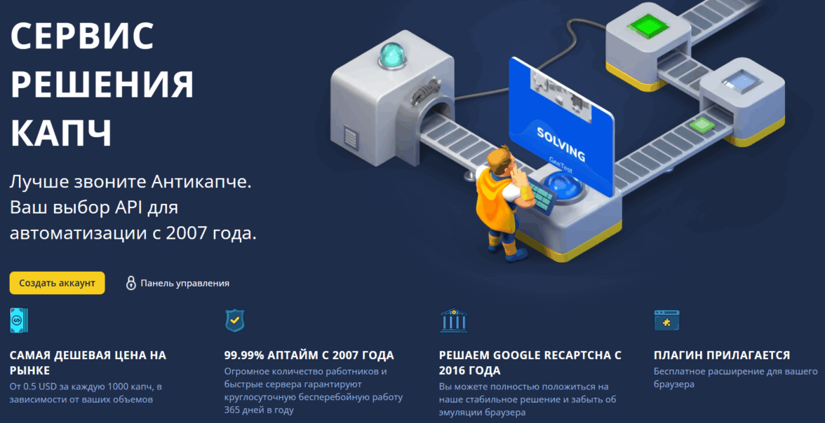 Сервис решает SmartCaptcha, reCaptcha, PazlCaptcha | Beta и текстовые капчи. Разработчики гарантируют аптайм 99%. Есть поддержка Turnstile.