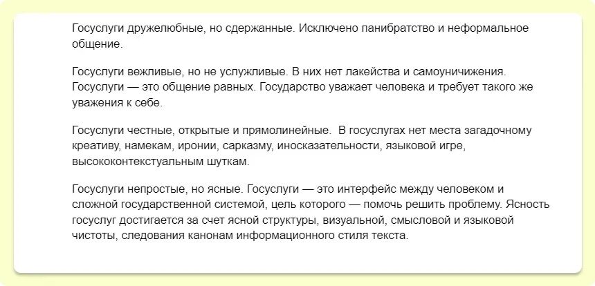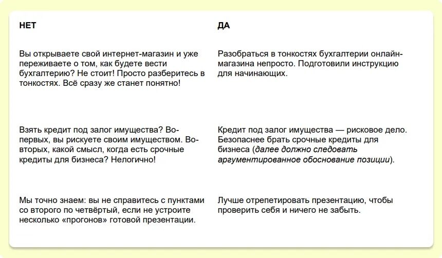 Примеры нежелательной подачи тоже стоит зафиксировать. Иначе может оказаться, что все слова «правильные», но бренд звучит не так, как хотелось бы — например, из-за излишней назидательности или агрессивной подачи. Это поможет избежать неуместных, оскорбительных или странных формулировок, которые непонятны аудитории.