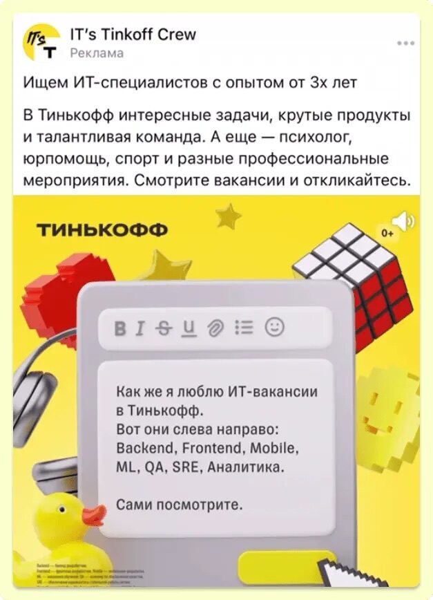 «Тинькофф» использует более лёгкую и шутливую манеру общения для продвижения HR-бренда, чем для рекламы своих основных продуктов