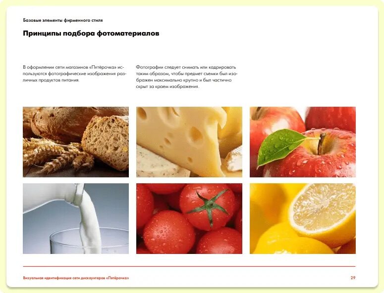 Принципы выбора фотографий из брендбука «Пятёрочки»: бренд стремится показать еду крупным планом, чтобы подчеркнуть её свежесть и высокое качество