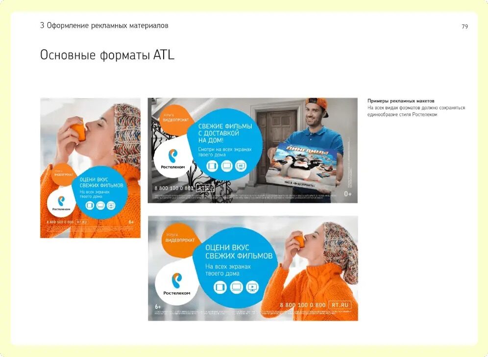 Принципы оформления рекламных баннеров в брендбуке «Ростелекома»: бренд использует плашки в фирменных цветах, крупный логотип и красочные изображения с людьми