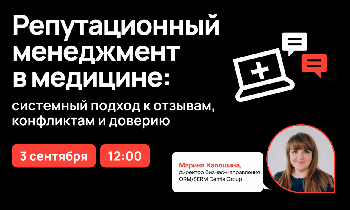 Спикер — Марина Калошина, директор бизнес-направления ORM & SERM в Demis Group, эксперт с более чем 10-летним опытом в управлении репутацией медицинских организаций и брендов.