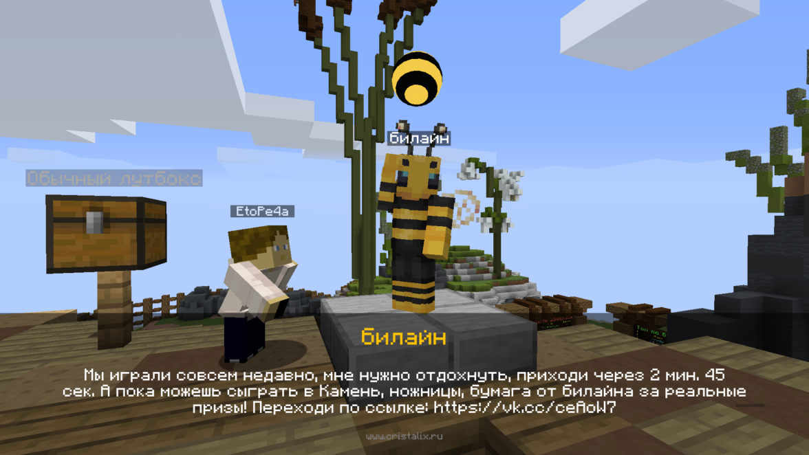 Билайн дал возможность сыграть в «Камень, ножницы, бумага» прямо на серверах Cristalix в Minecraft и сразу же получить внутриигровой подарок, а за настоящими призами победитель мог отправиться на сайт компании. Мы интегрировали в Minecraft на серверах Cristalix бота пчелу. При входе пользователя в игру на любой из серверов Cristalix он предлагал сыграть в «Камень, ножницы, бумага». Если пользователь выигрывал, бот награждал его призом — забавным аксессуаром-роботом для украшения своего игрового персонажа, а также предлагал всем игрокам перейти на сайт билайна и узнать больше о кампании.