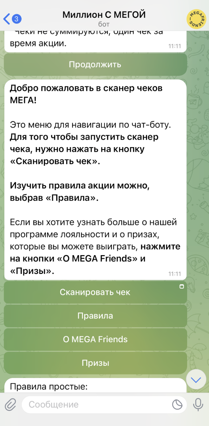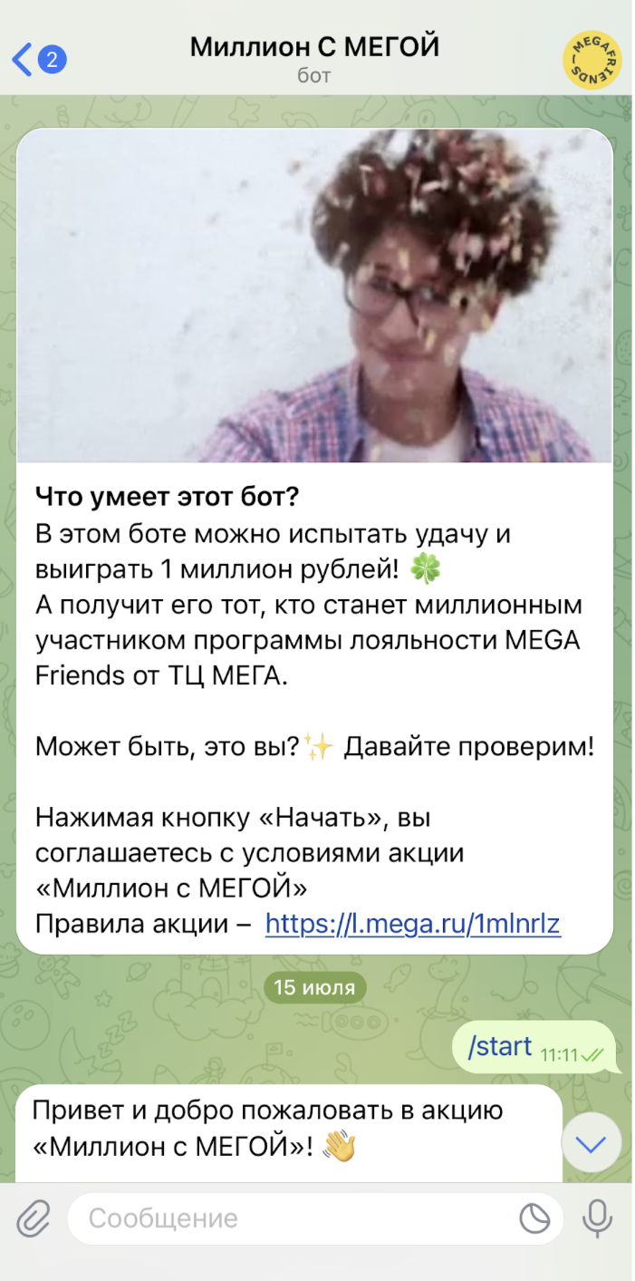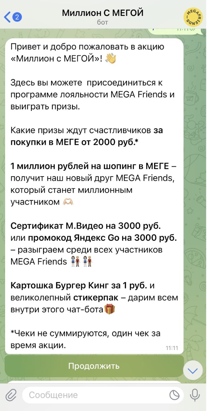 Чат-бот в Telegram вновь подтвердил свою эффективность в привлечении новых участников к программе лояльности MEGA Friends, укрепив ранее выдвинутую гипотезу на основе предыдущих проектов. Именно через этот бот был зарегистрирован миллионный пользователь, получивший главный приз.