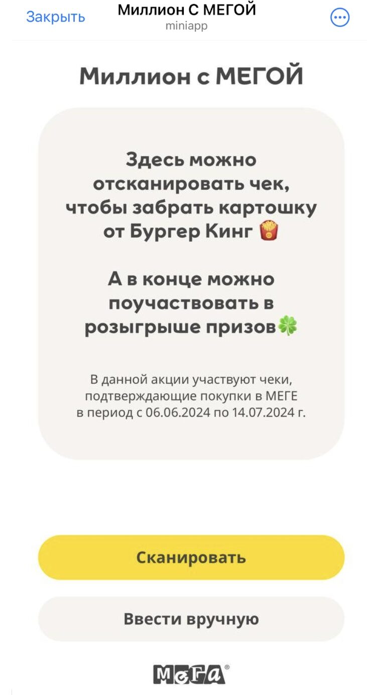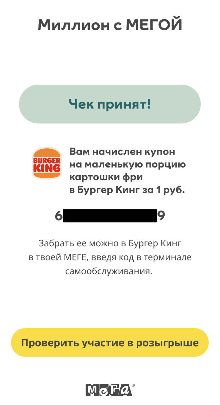 Чтобы принять участие в акции, гости МЕГИ должны были зарегистрироваться в MEGA Friends, сделать покупку на сумму от 2 000 рублей, отсканировать чек и отправить его через чат-бот в Telegram. В случае успеха гость получал промокод на бесплатную порцию картошки фри в Бургер Кинг и купон на розыгрыш призового фонда.